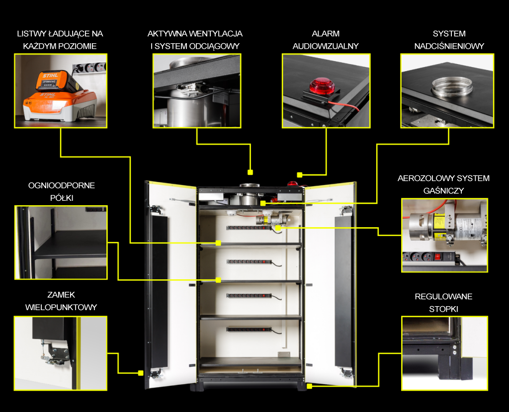 Idealna do użytku w rowerach elektrycznych, hulajnogach elektrycznych, dronach, skanerach, laptopach, narzędziach ręcznych i ogrodowych oraz innych urządzeniach. Ta szafa chroni nie tylko twoje baterie, ale także otoczenie przed ryzykiem pożaru i termicznym wybuchem.